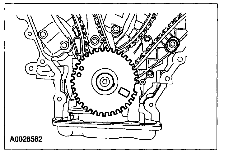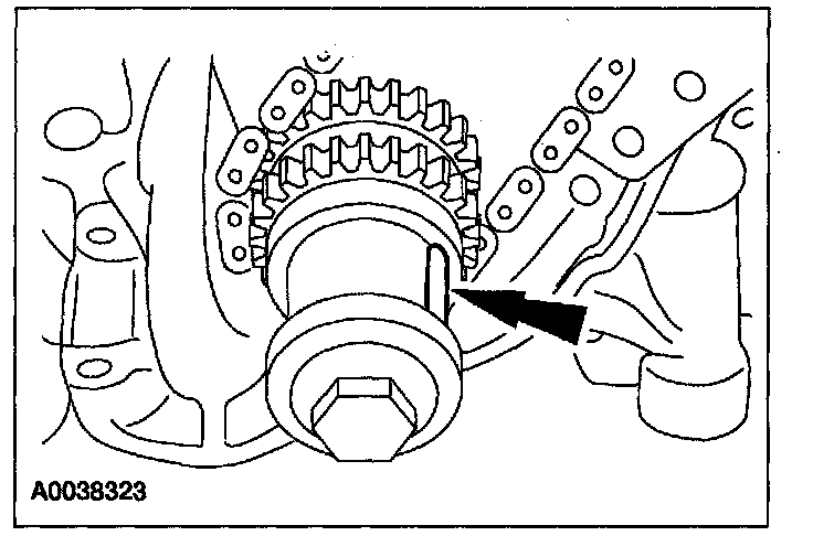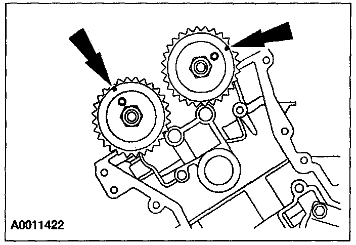 ^ Align the marks on the timing chain with the marks on the camshaft and crankshaft sprockets.