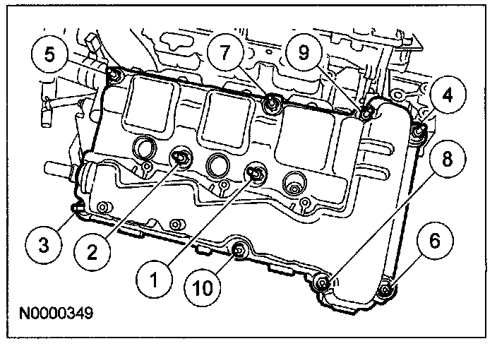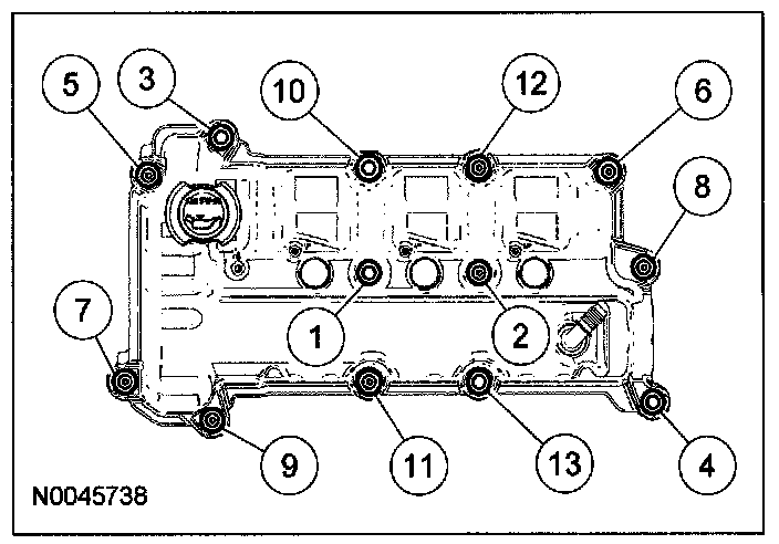 50. Position the LH valve cover and install the bolts and stud bolts. Tighten the bolts and stud bolts in the sequence shown.