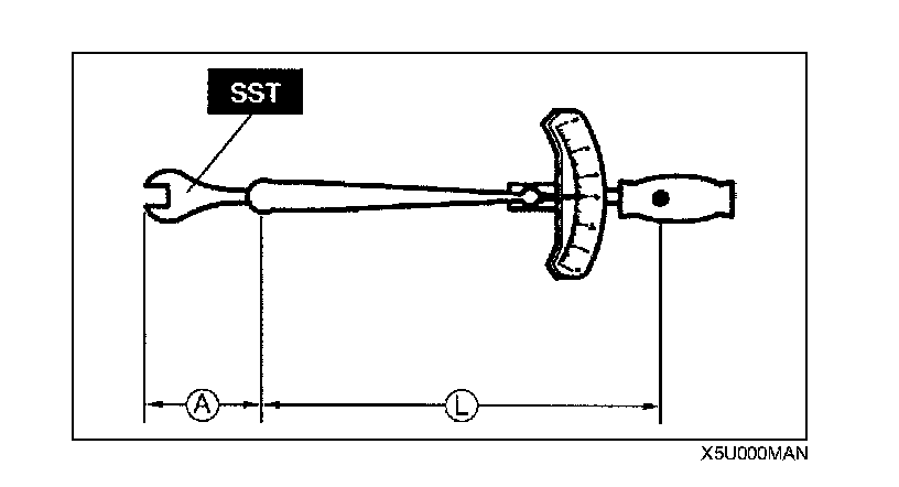 ^ When using a torque wrench-SST or equivalent combination, the written torque must be recalculated due to the extra length that the SST or equivalent adds to the torque wrench. Recalculate the torque using the following formulas. Choose the formula that applies to you.