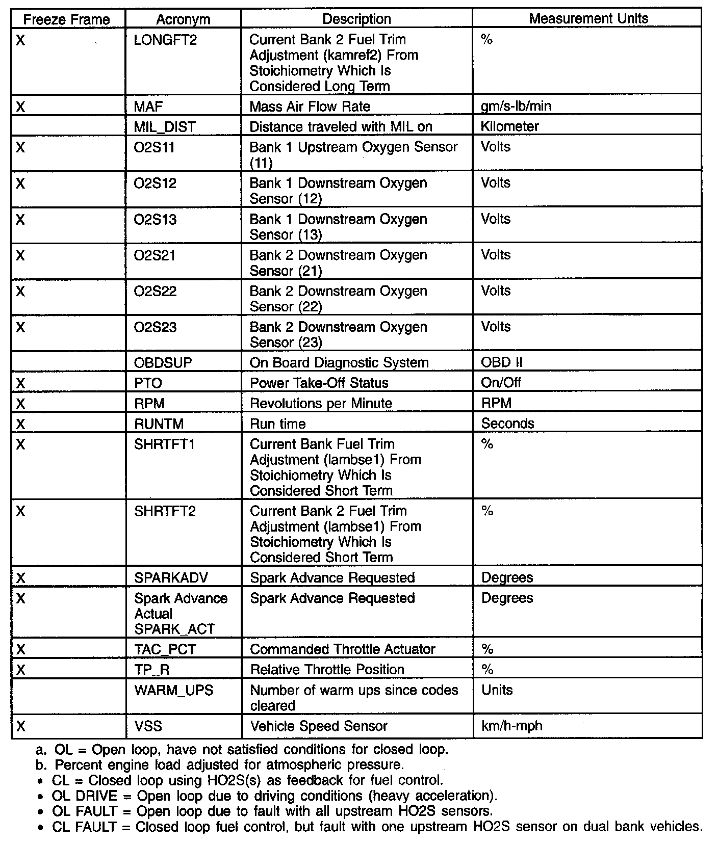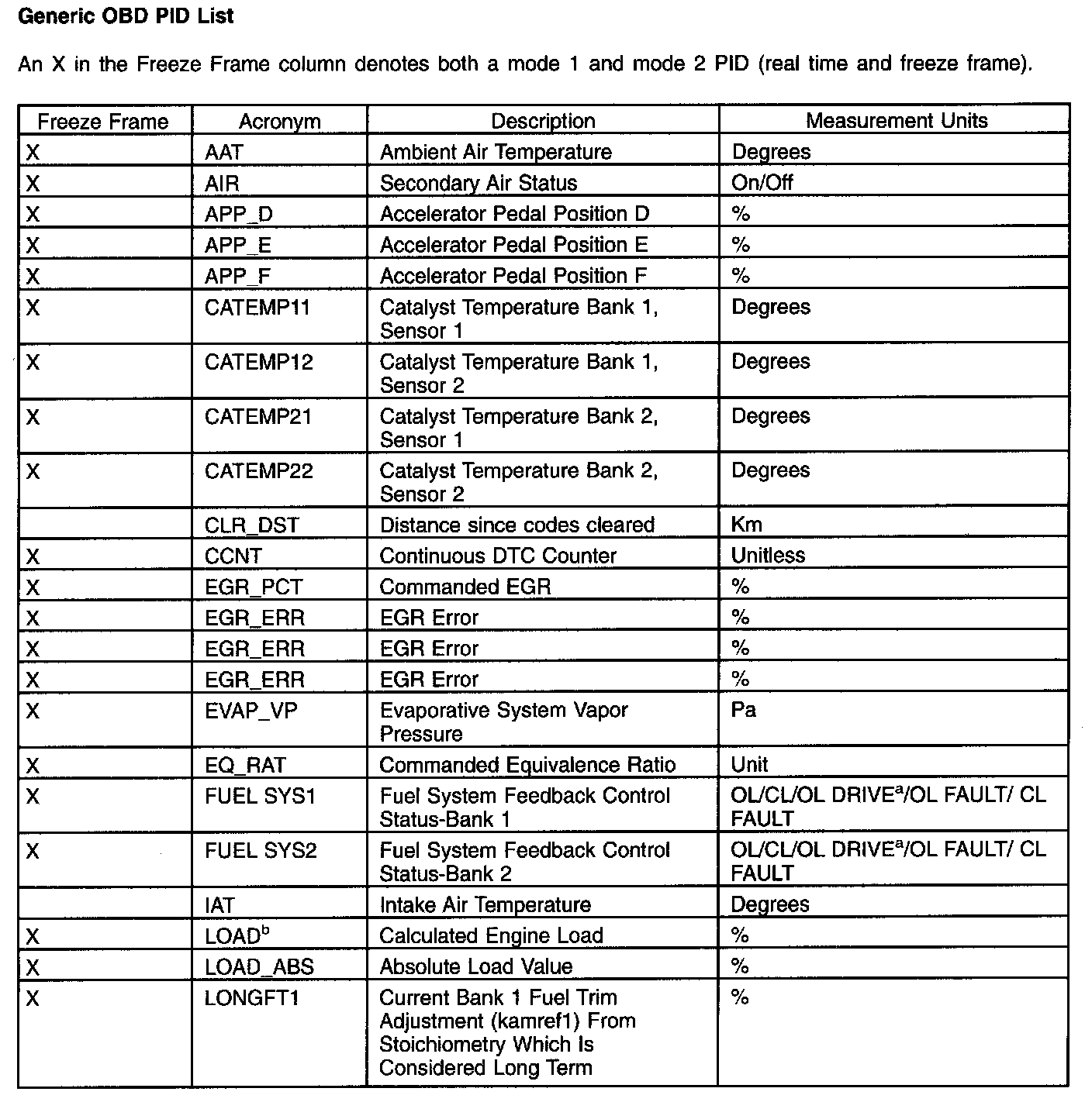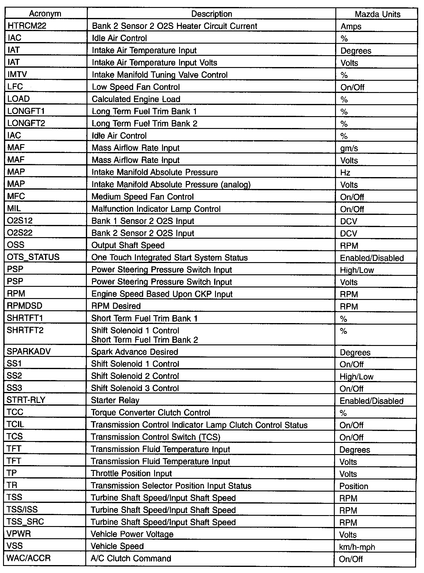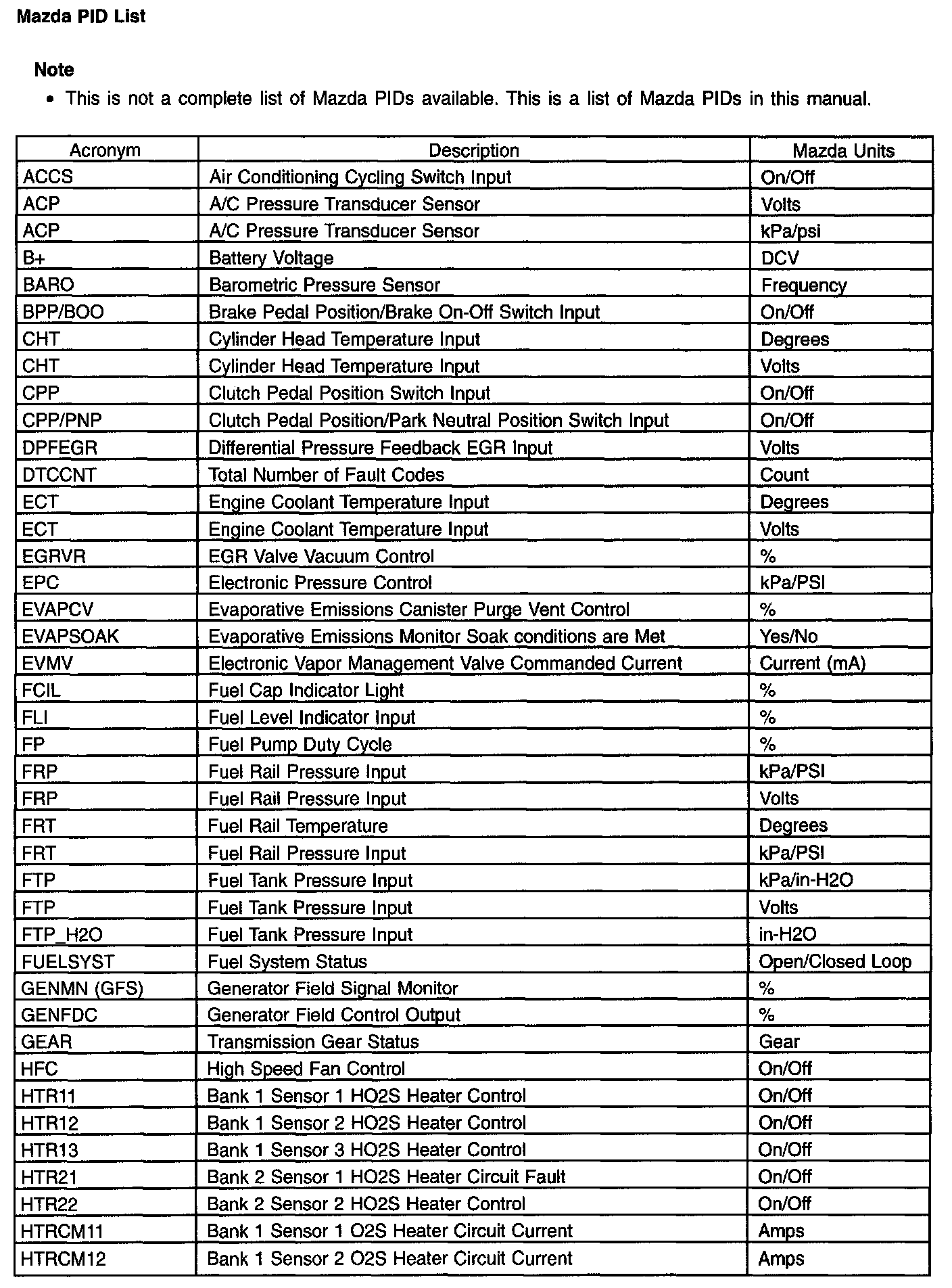The parameter identification (PID) mode allows access to PCM information. This includes analog and digital signal inputs and outputs along with calculated values and the system status. There are 2 types of PID lists available and both are used throughout this manual. The first is the generic (J1979) OBD PID list. This is a standard set of PIDs that all scan tools must be able to access. The second is a Mazda-specific (J2190) list which can be accessed by an appropriate scan tool. When accessing any of these PIDs, the values are continuously updated. The generic or Mazda PID list provides definitions and values in appropriate units. For more information, refer to the Society of Automotive Engineers (SAE) document J2205.