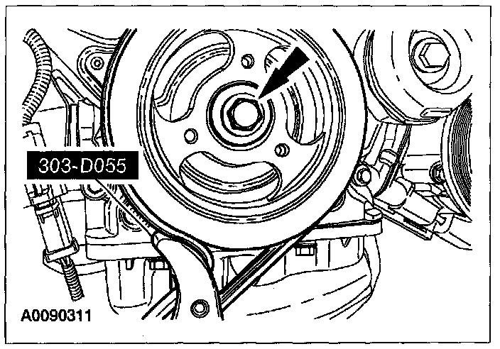 Install the bolt and washer. Using the special tool to hold the crankshaft pulley, tighten the bolt in 4 stages: