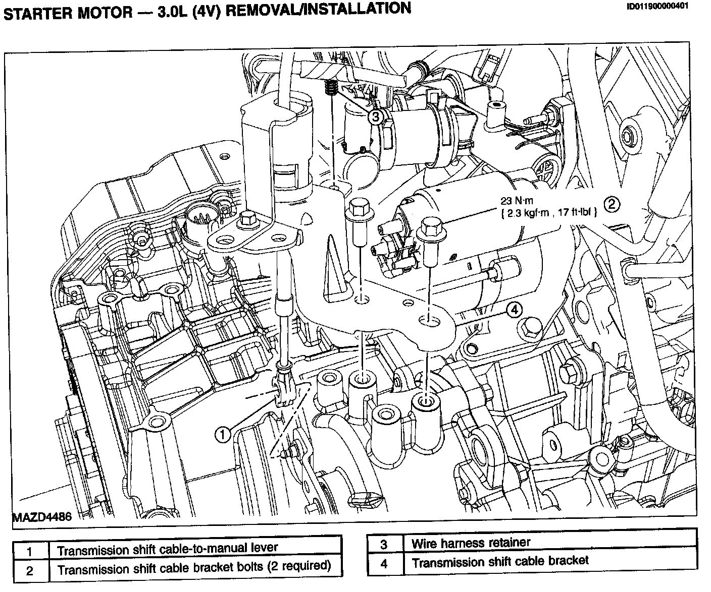 4. Remove the 2 transmission cable bracket bolts and detach the wire harness retainer and position aside the transmission cable and bracket.