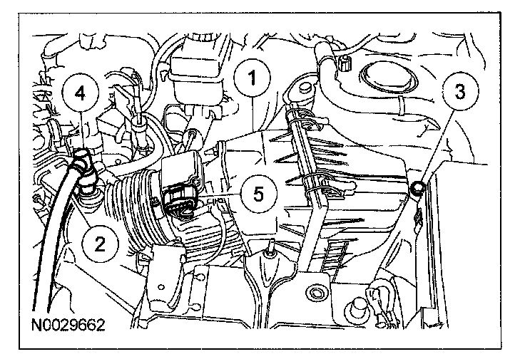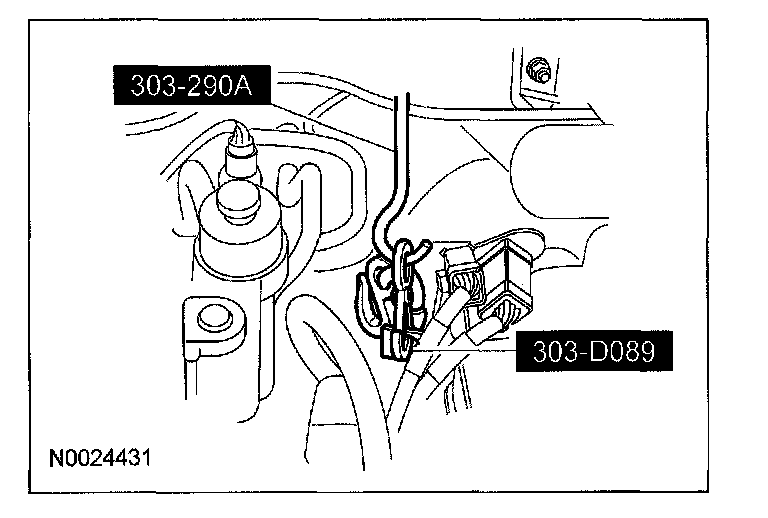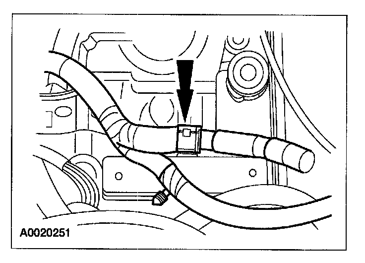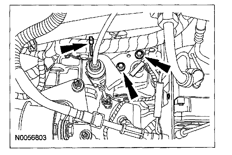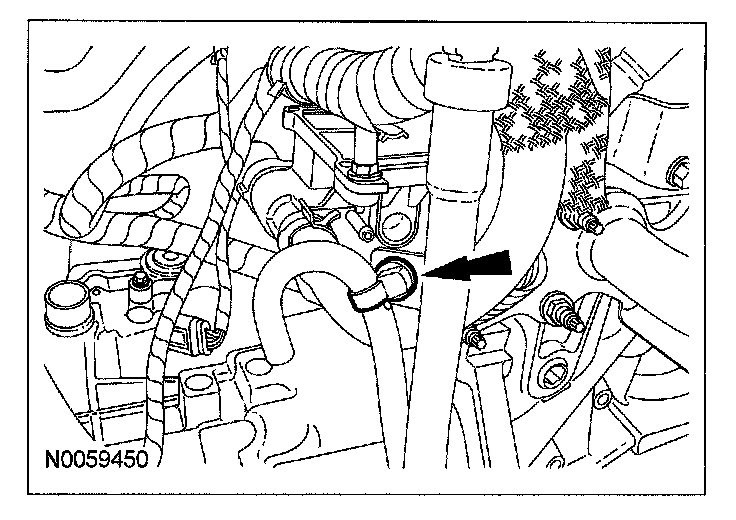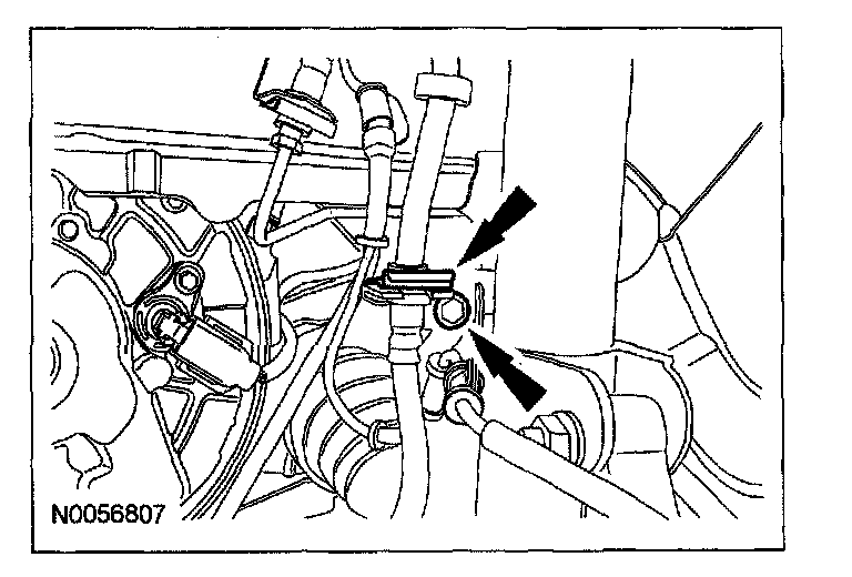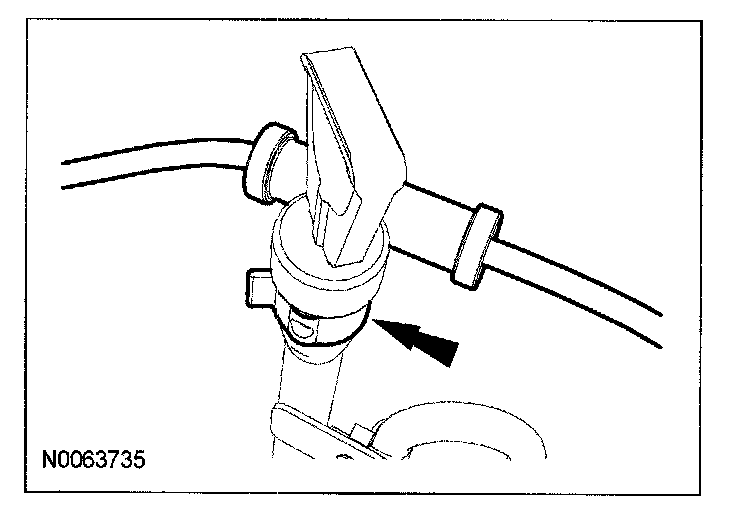 59. Connect the evaporative emissions (EVAP) and PTU vent hose to the transaxle filler tube bracket.