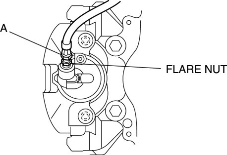 2. Tighten the flare nut while holding the brake hose at point A with a spanner or equivalent.
