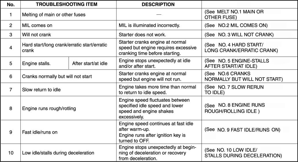 - Symptom troubleshooting shows diagnostic procedures, inspection methods, and proper action to take for each trouble symptom.