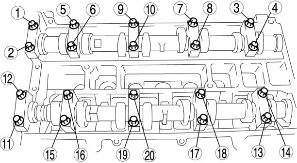 1. Loosen the camshaft cap bolts in 2-3 passes in the order shown in the figure.