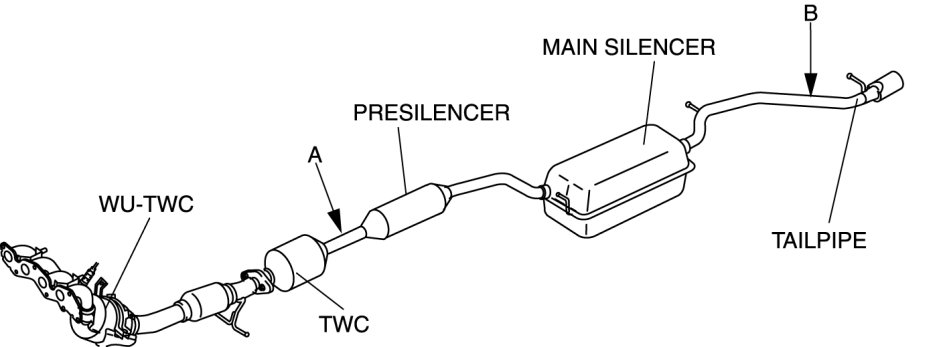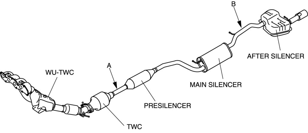 - The presilencer and main silencer are integrated with the TWC and tailpipe. Therefore, when replacing the presilencer and main silencer, cut between the TWC and presilencer, and between the main silencer and tailpipe.