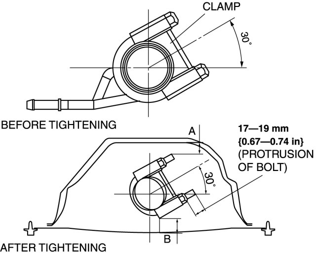 b. Set the U-shaped bolt so that the clearance between the bolt and surrounding parts is as indicated in the figure.