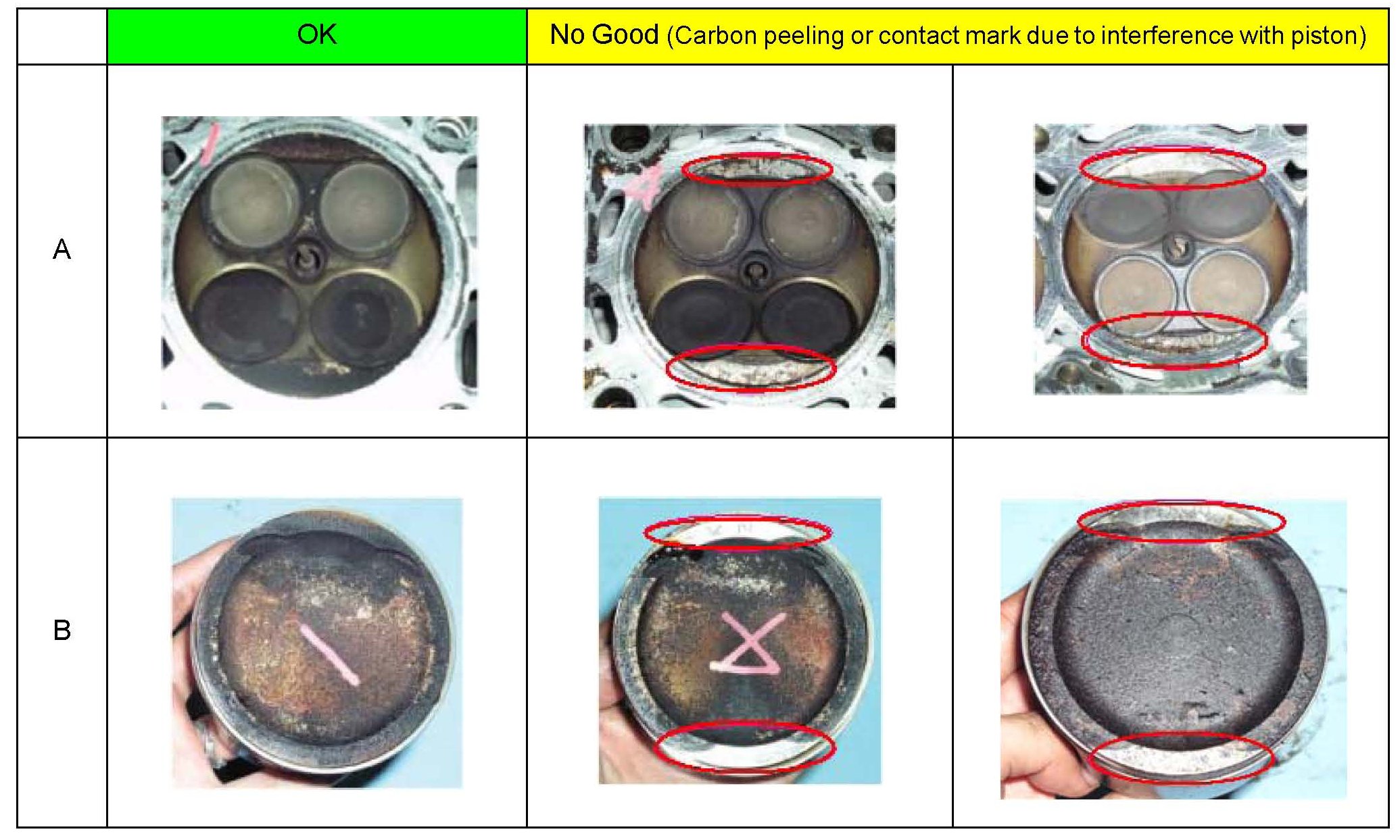 ^ Check for contact mark between the cylinder head (A) and piston (B). Check for carbon peeling or valve to piston interference.
