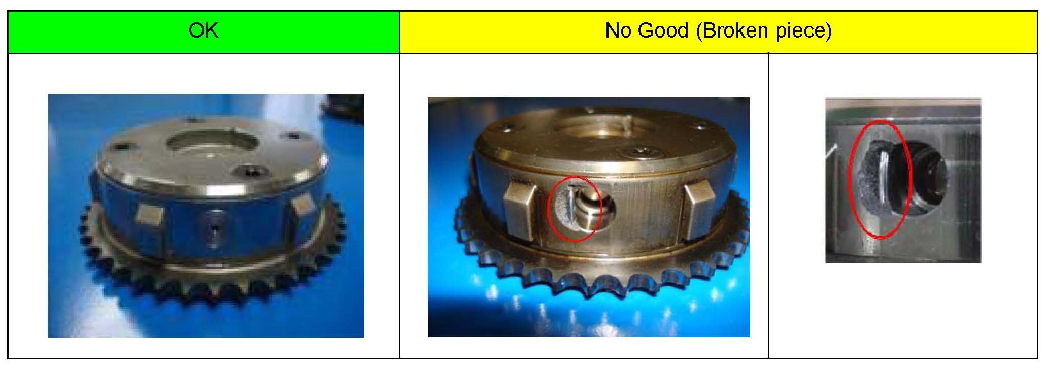 ^ Check for Damage or cracks near lock pin stopper. Check for a locked VVT at the most retarded position (Refer to TSB 01-002/08).
