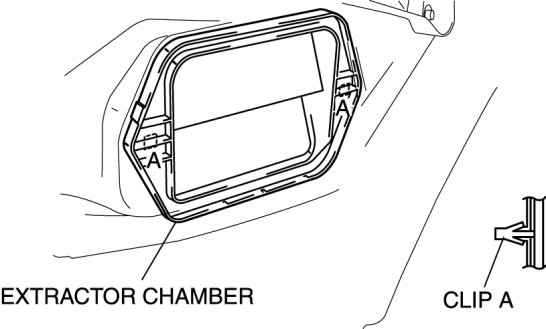 2. Detach clips A by squeezing them from inside the vehicle, and remove the extractor chamber from the body.