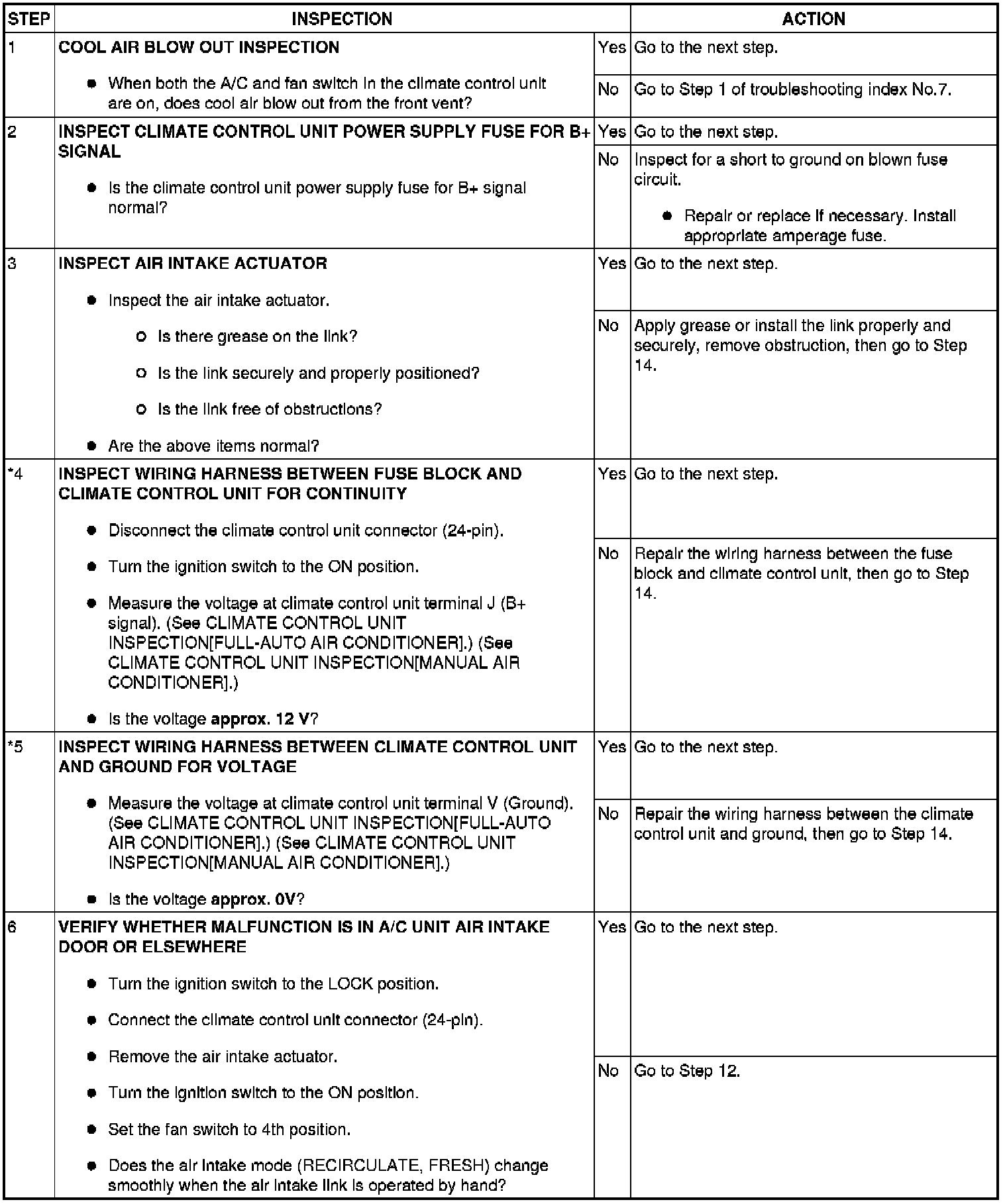 - When performing an asterisked (*) troubleshooting inspection, shake the wiring harness and connectors while doing the inspection to discover whether poor contact points are the cause of any intermittent malfunctions. If there is a problem, inspect to make sure connectors, terminals and wiring harness are connected correctly and undamaged.