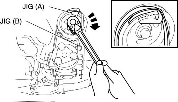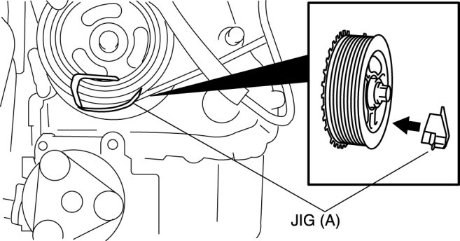 3. Install a jig (A) to the crankshaft pulley as shown in the figure.