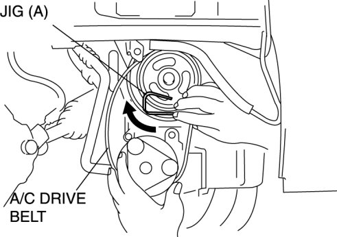 4. Install a new A/C drive belt to the A/C compressor pulley, move jig (A) upward, and then install the A/C drive belt to the crankshaft pulley.