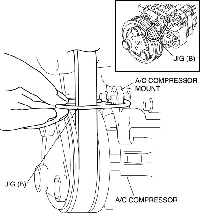 - Do not pass jig (B) through the A/C compressor mount hole.