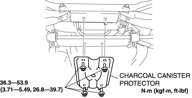 6. Loosen the rear crossmember installation nuts (6 locations) and lower the rear crossmember approx. 140 mm {5.5 in}. Service and Repair