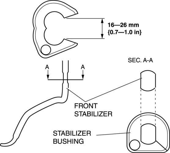 2. Widen the stabilizer bushing opening 16-26 mm {0.7-1.0 in} and install the bushing to the front stabilizer as shown in the figure.
