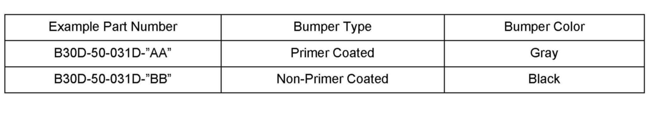 To distinguish a primer coated bumper from a non-primer coated bumper, check the last two digits of the part number (Example: AA or blank = primer coated bumper; BB = non-primer coated bumper).
