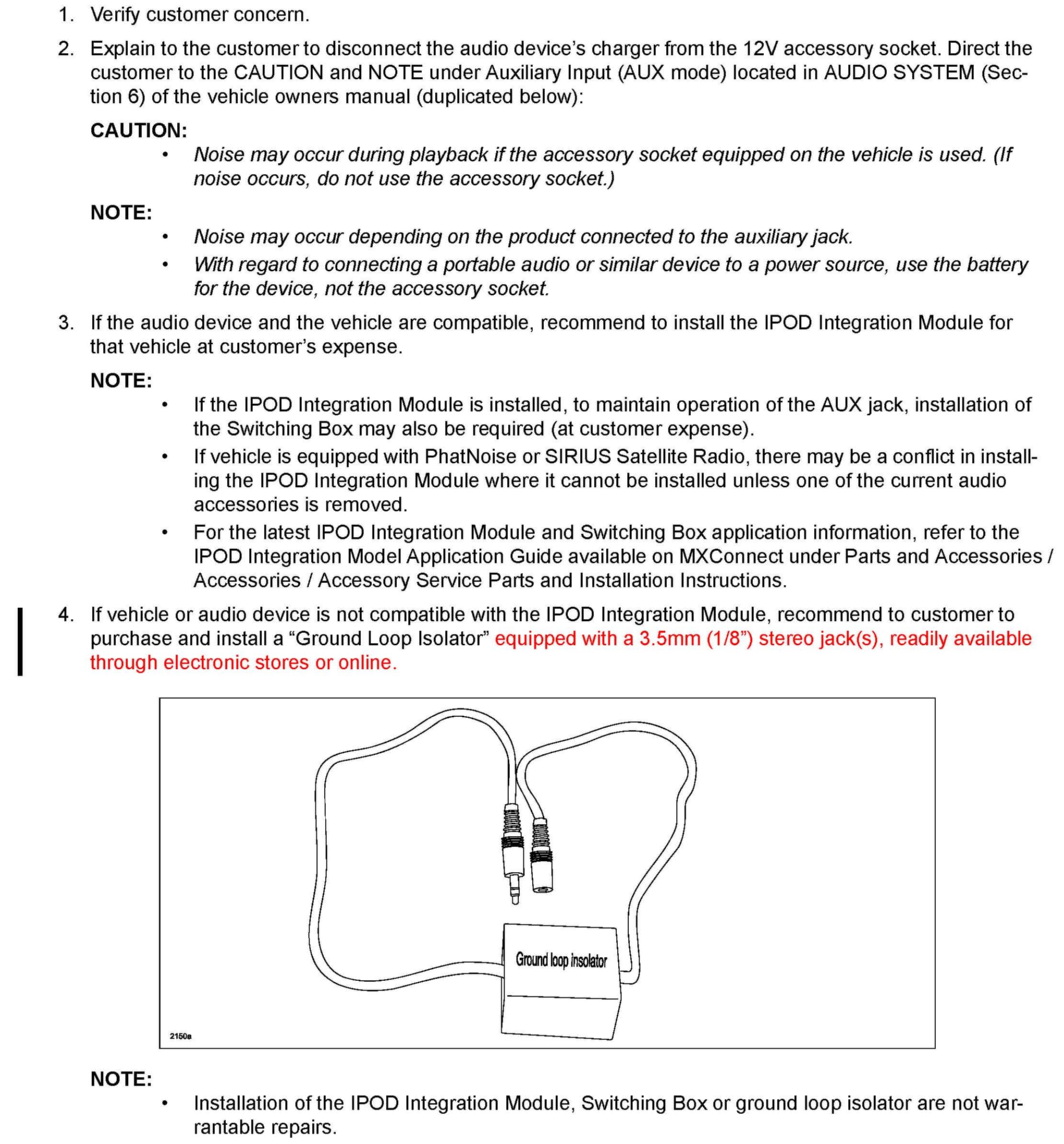 Some customers may complain about noise from the speakers when using a portable audio device (such as an MP3 player) connected to the vehicle's audio system via the auxiliary (AUX) jack while powering the device (through the device's charger) using the vehicle's 12V accessory socket.