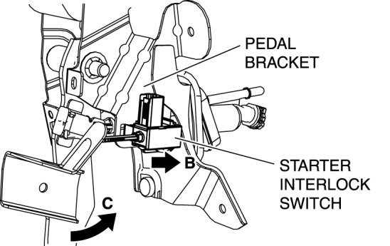 3. Press the clutch pedal fully in the direction indicated by arrow C and adjust the starter interlock switch terminal.