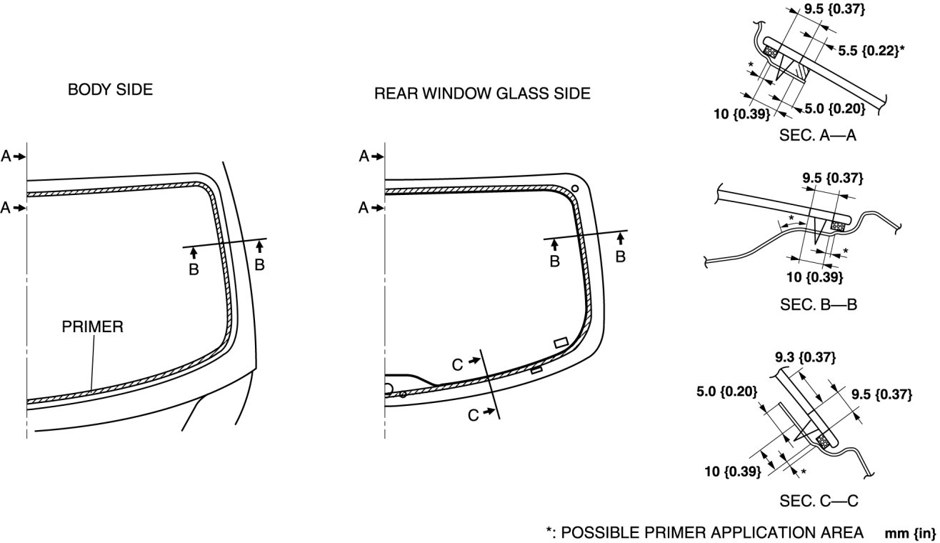 5. Apply glass primer on the rear window glass, and body primer on the rear window glass molding as shown in the figure. Allow it to dry for approx. 30 min.