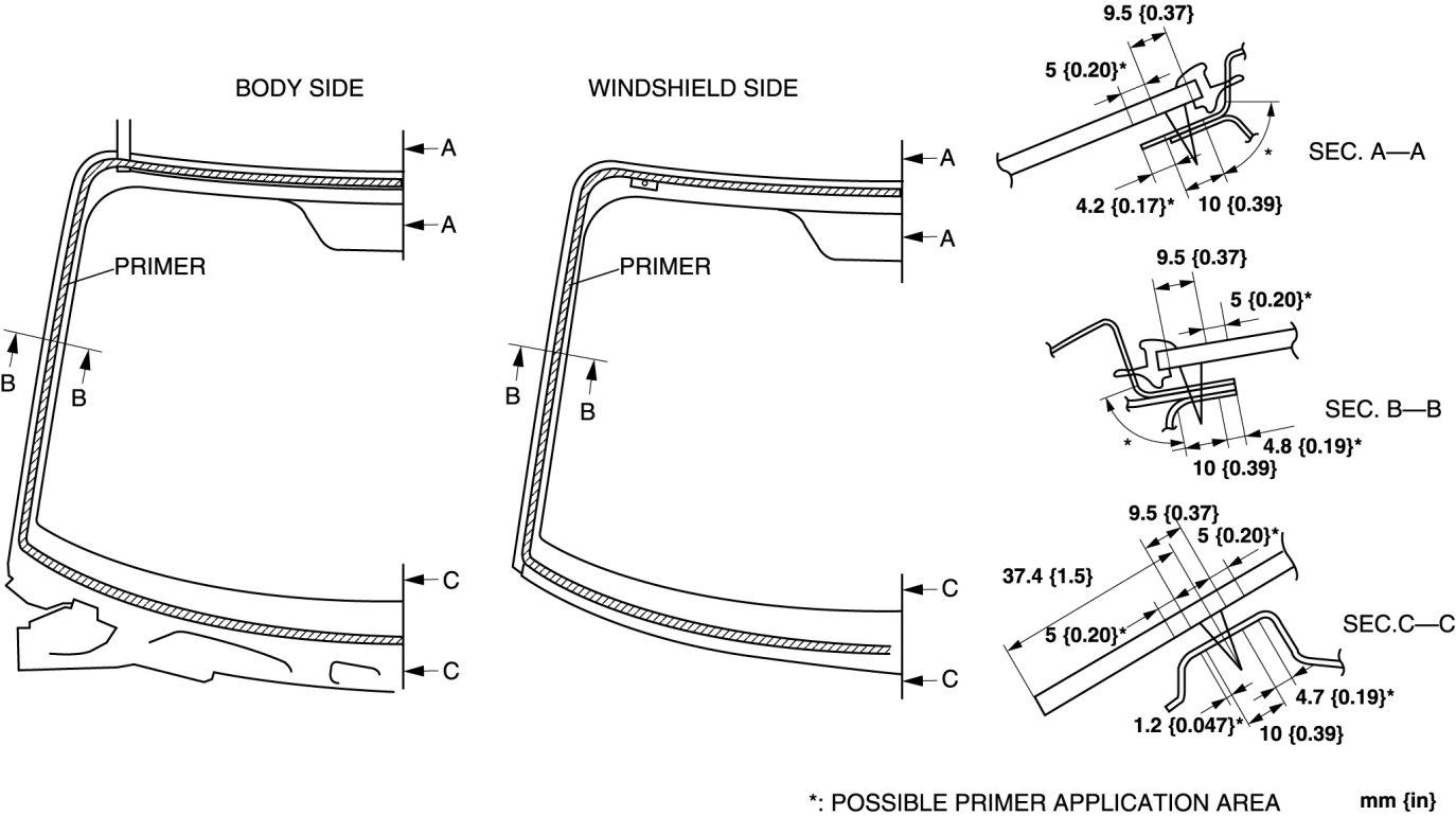 2. If the sealant has come off completely in any one place, apply some primer after degreasing, and allow it to dry for approx. 30 min. Then apply a 2 mm {0.08 in} thickness of sealant.