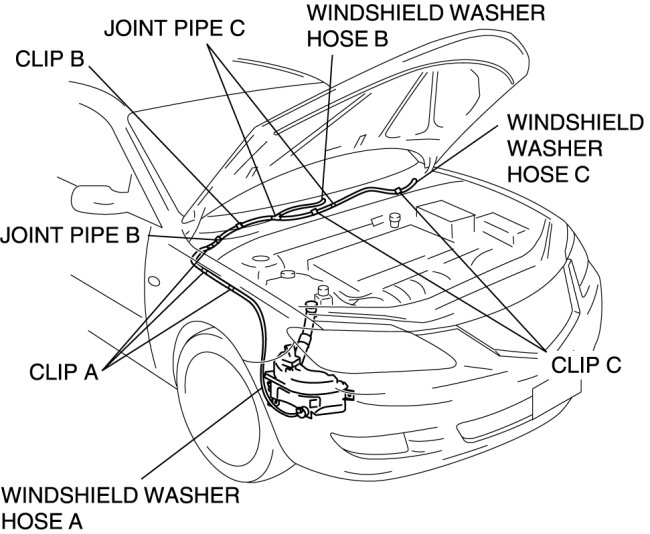 11. Disconnect joint pipe B, then remove windshield washer hose A, B and C.