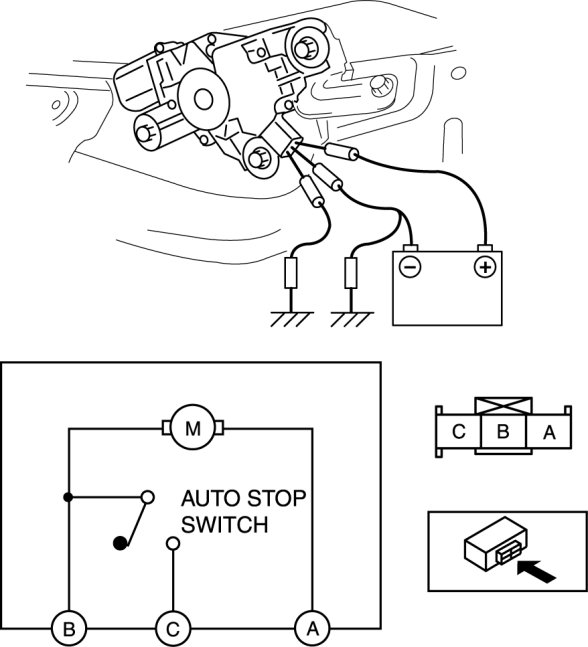 1. Connect battery positive voltage to the rear wiper motor terminal B, and ground the rear wiper motor terminal A.
