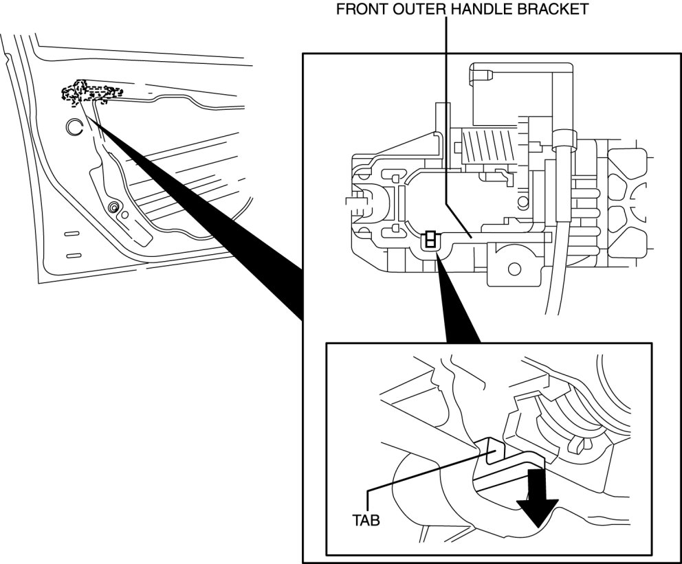 7. Press the tab on the front outer handle bracket in the direction of the arrow.