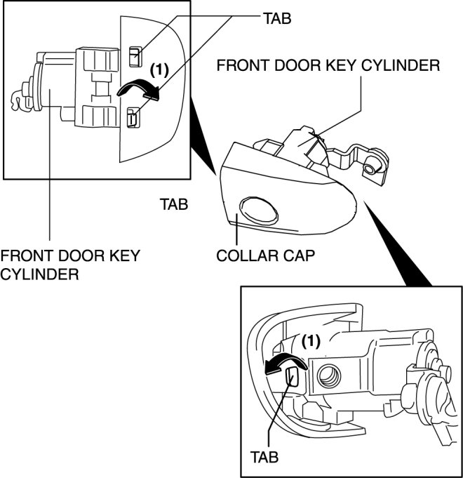 9. Using a tape-wrapped fastener remover, press up the collar cap in the direction of the arrow shown in the arrow, press aside the front door key cylinder tabs (1), and remove the collar cover from the front door key cylinder.