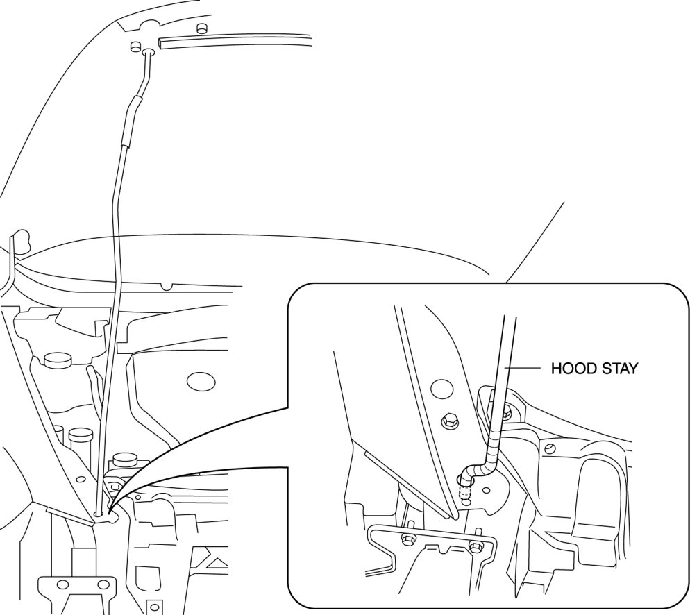 - Since the servicing is performed with the hood open, secure the hood using a piece of wood to prevent it from falling.