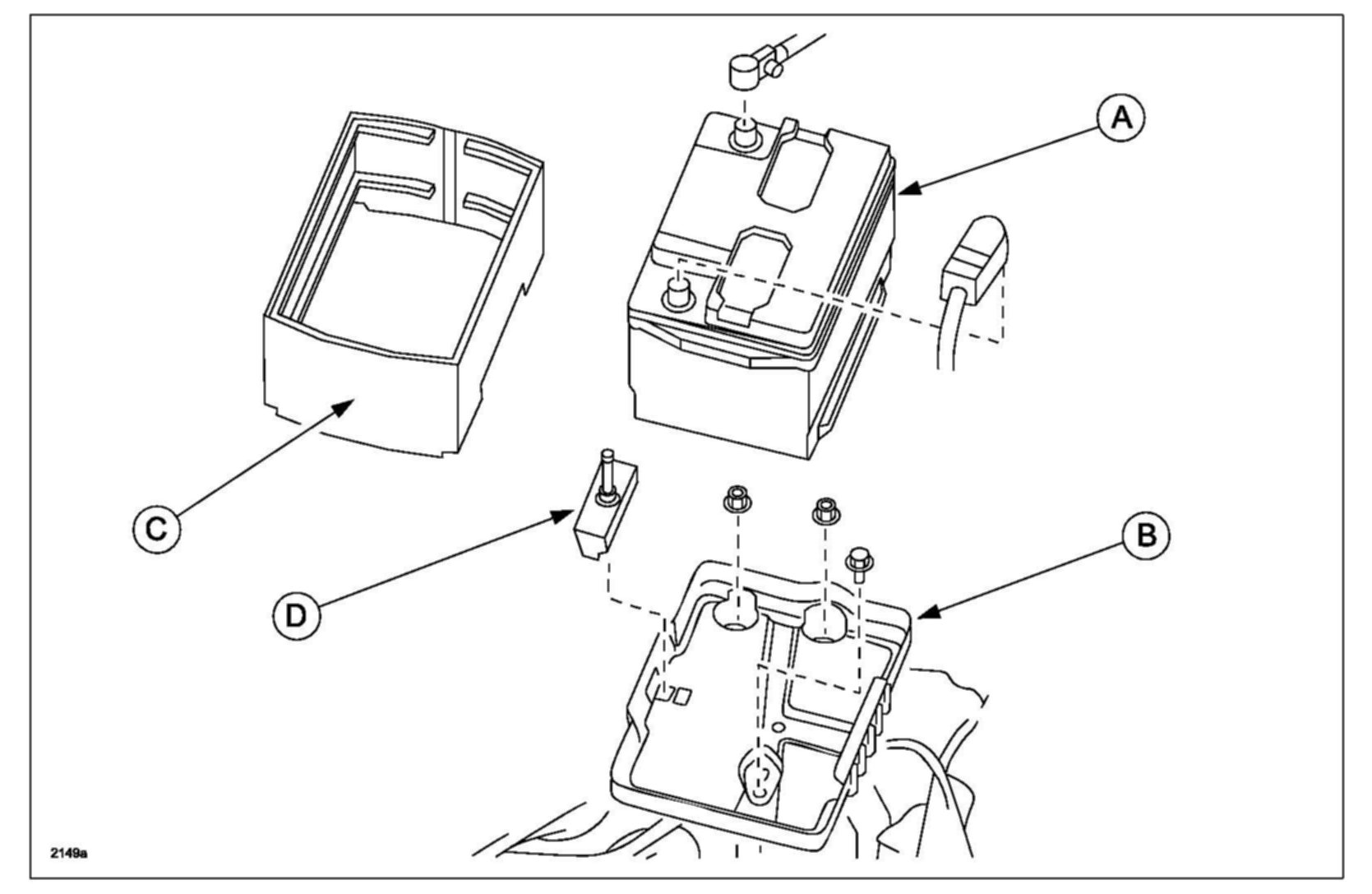 4. Remove battery clamp (D), battery box (C), battery (A) and battery tray (B).