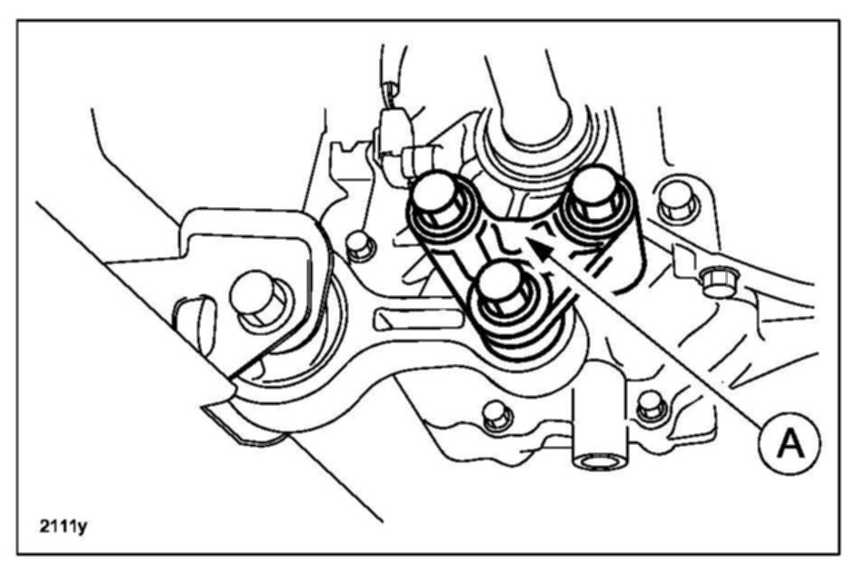 11. Before loosening the bolts securing the engine and transmission, put a mark on each transaxle bolt and the transaxle (so you can determine when they have been turned one full turn), then loosen the bolts one full turn (360 degrees).