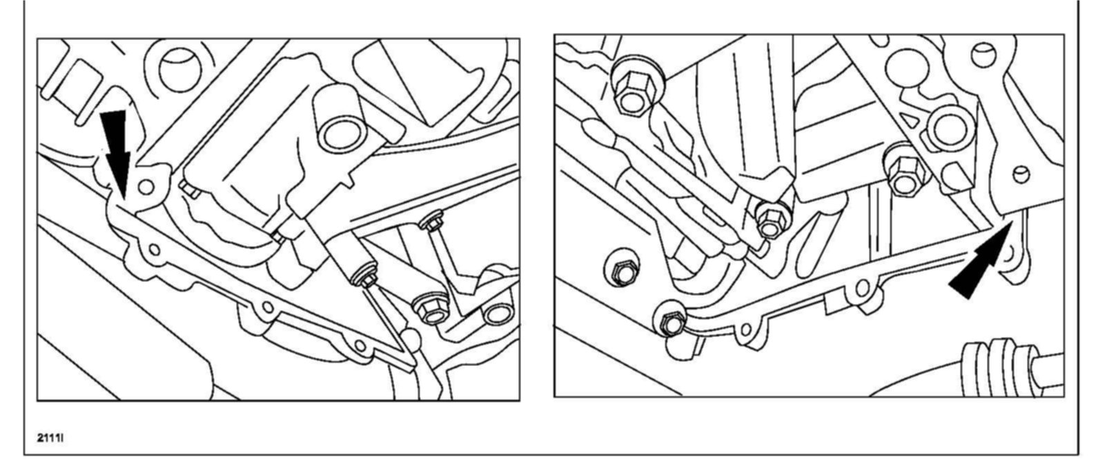 e. Apply an ample amount to the front cover where the oil pan is fitted (A), and also apply an extra amount (a ball of approximately 5mm in diameter) of silicone sealant to the corners of the front case and the cylinder block (B).