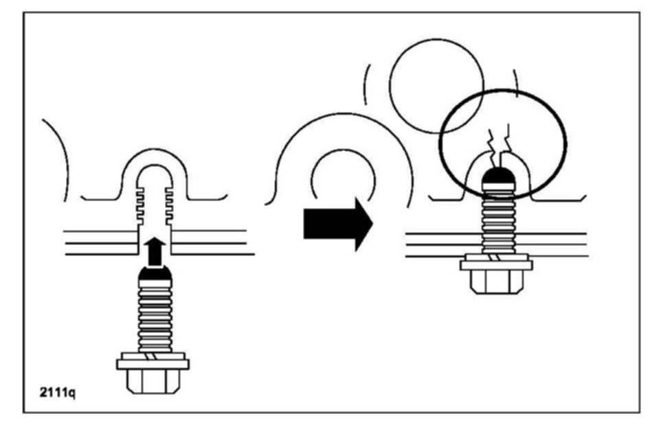 b. Install front cover stud bolt directly under crank pulley lock bolt.