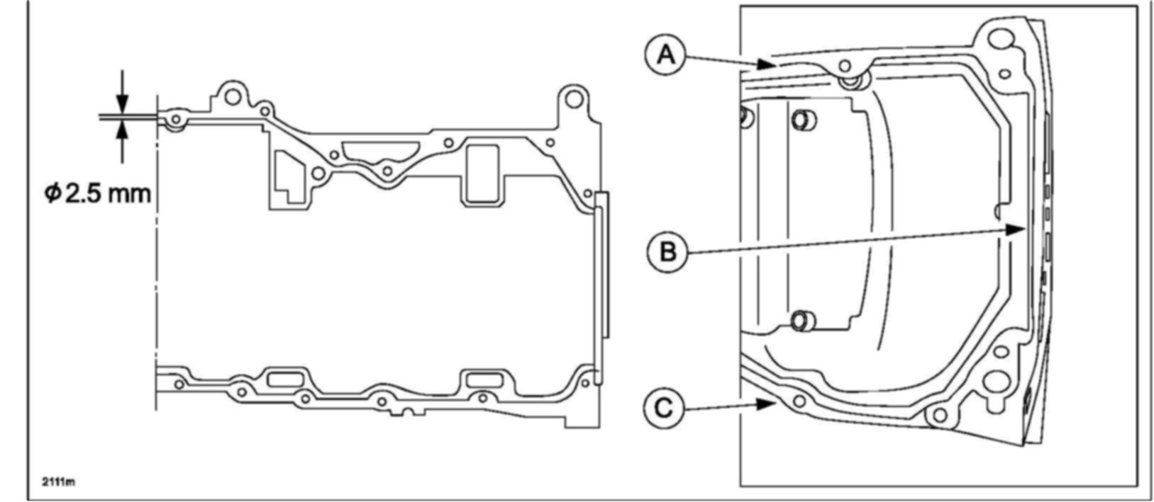 b. Apply a 2.5 mm bead to the rear edge (B) of the oil pan (approximately 5mm from the rear edge).