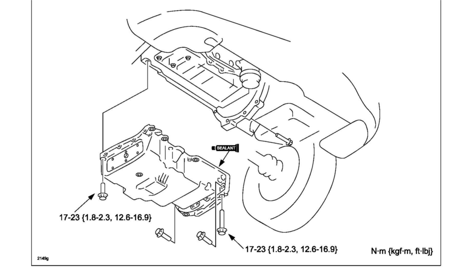 The thickness of silicone sealant tends to be thin because the clearance between the oil pan and the transmission and the front cover and transmission is almost zero during oil pan reinstallation. Allow 3mm space maximum between the engine and transmission with the transaxle bolts loosened one full turn before reinstalling the oil pan.