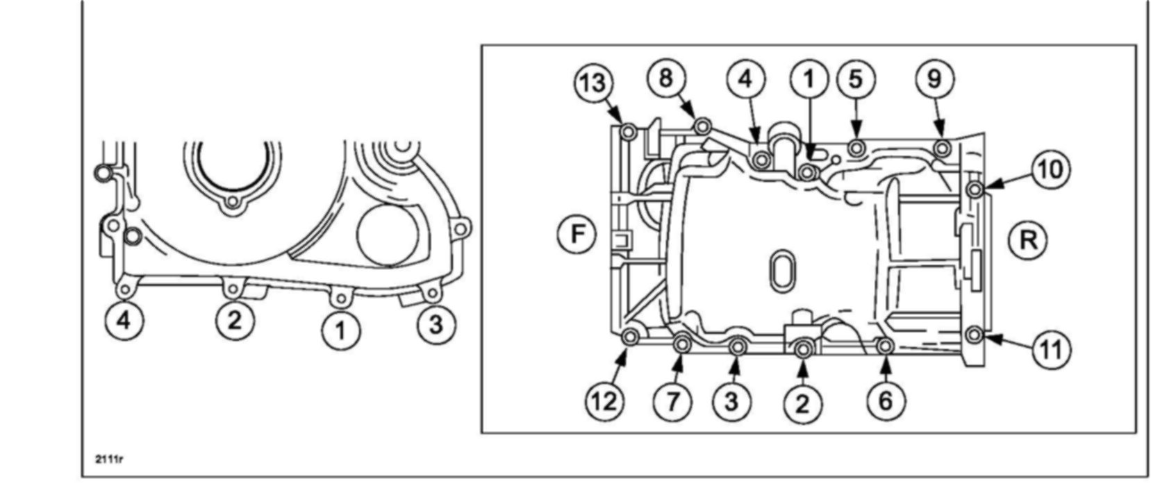 f. Tighten thirteen (13) oil pan bolts to 17.0-23.0 N.m (12.6-16.9 ft-lbf) in the order shown.