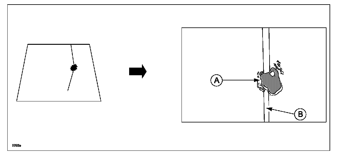 Cause: Crack (B) occurs when flying debris such as small stones or fallen objects on the road hit the windshield while driving the vehicle.