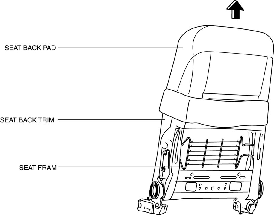 12. Remove the seat back trim and the seat back pad as a single unit from the seat frame by pulling them in the direction of the arrow.