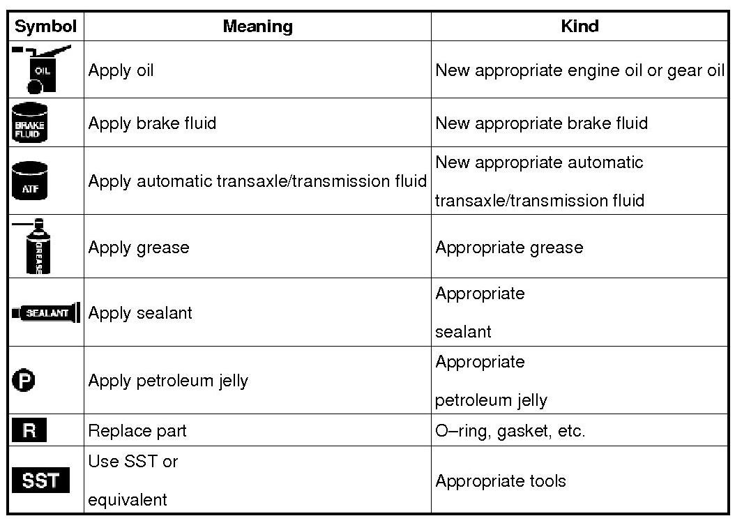 - There are eight symbols indicating oil, grease, fluids, sealant, and the use of SST or equivalent. use. These symbols show application points or use of these materials during service.
