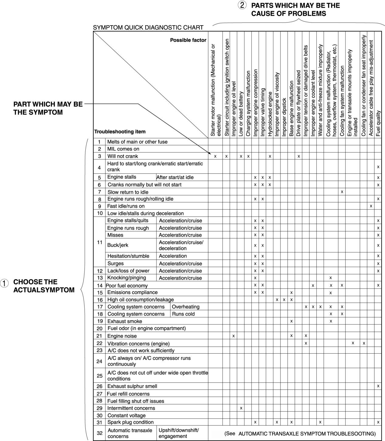 - The chart is effective in quickly narrowing down the relation between symptom and cause of the malfunction. It also specifies a range of common causes when multiple malfunction symptoms occur.