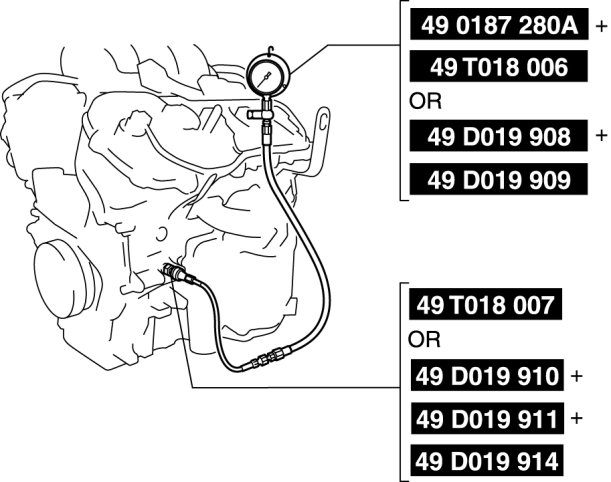 - This inspection can be performed using a combination of SSTs 49 0187 280A (oil pressure gauge), 49 T018 006 (hose) and 49 T018 007 (adapter), or using the following combination of the SSTs.