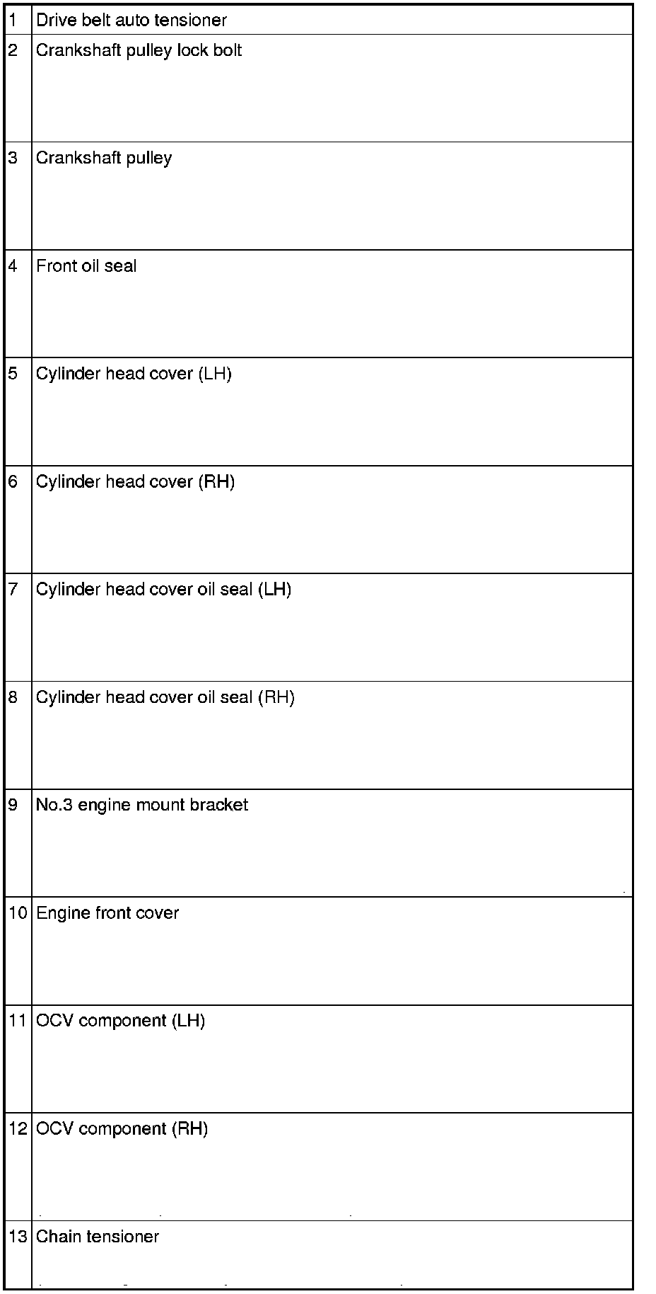 1. Loosen the engine front cover and No.3 engine mount bracket bolts in the order shown in the figure.