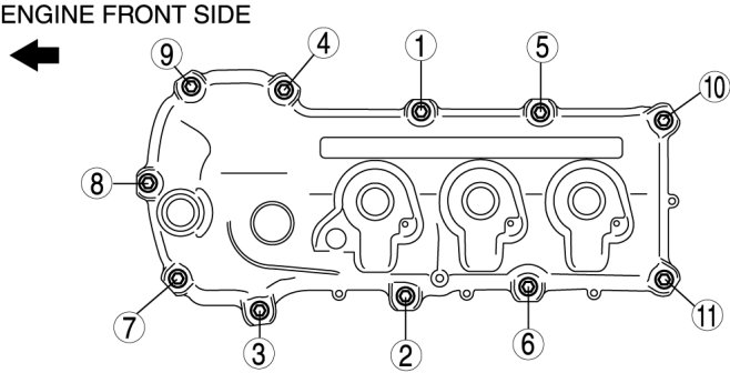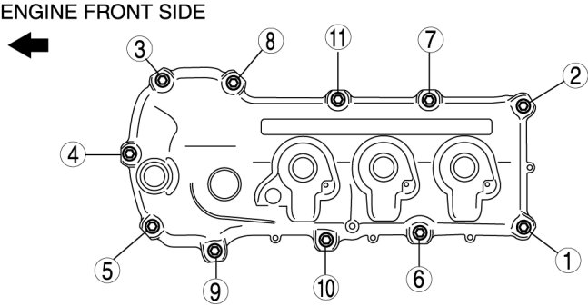 - Install the cylinder head cover bolt and studs within 5 min of applying the silicone sealant.