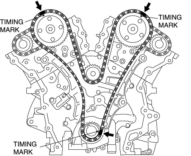 - When the timing chain is replaced with a new one, mark the new timing chain at the same positions as the removed timing chain.