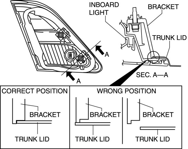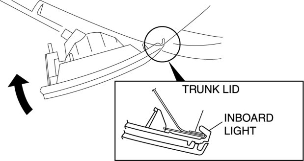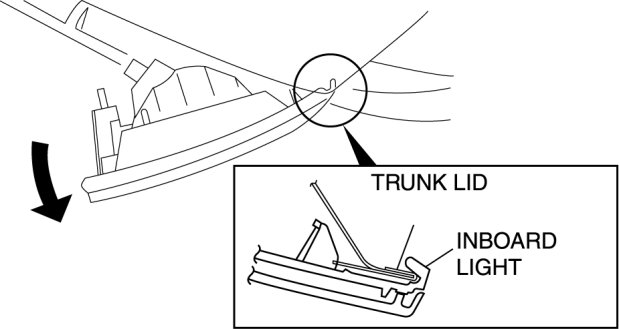 1. Insert the inboard light into the trunk lid as shown in the figure, then pivot it inward and fix in place.