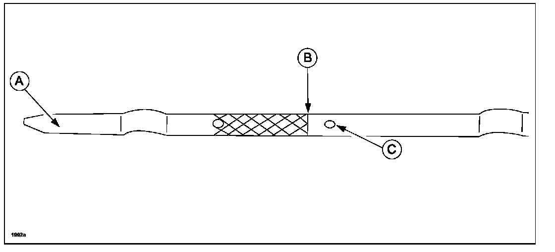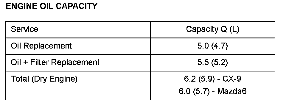 When inspecting the engine oil level on the dipstick (A) of 2007-2009 CX-9 or 2009 Mazda6 vehicles equipped with 3.5L/3.7L engines, it is important to understand that the oil is full when it reaches the upper portion of the cross hatched area (B). Filling until the oil level reaches the upper dot above the cross hatched area (C) could result in oil overfill and aeration of the oil. Due to the 3.5L/3.7L engines internal design, it takes longer for all the oil to drain back to the oil pan after the engine is shut off than other Mazda engines.