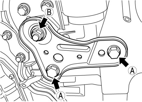5. Install the crossmember bracket bolts A, and tighten the crossmember nut B.