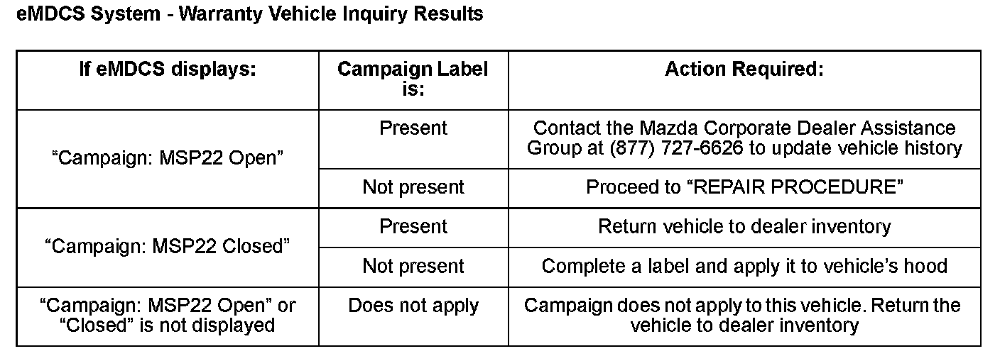 ^ BEFORE PERFORMING ANY REPAIR, VALIDATE THAT THE VEHICLE IS APPLICABLE TO THIS PROGRAM BY PERFORMING AN "eMDCS WARRANTY VEHICLE INQUIRY" AND VERIFYING THE VEHICLE DISPLAYS CAMPAIGN "MSP22" AND ITS CAMPAIGN STATUS DISPLAYS "OPEN". SEE "VEHICLE INSPECTION PROCEDURE" BELOW.